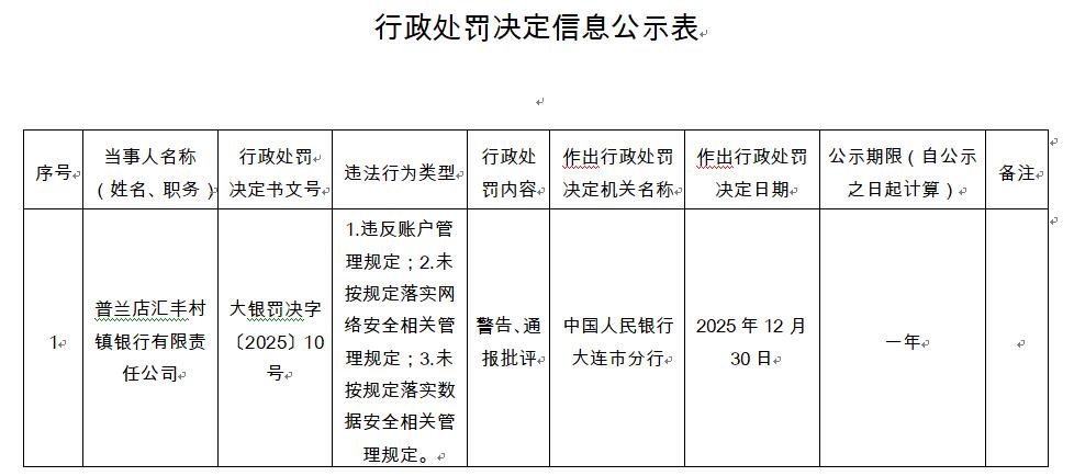 中国经济网北京1月6日讯 中国人民银行大连市分行近日发布的行政处罚决定信息公示表(大银罚决字〔2025〕10号)显示,普兰店汇丰村镇银行有限责任公司存在以下违法行为类型:1.违反账户管理规定;2.未按规定落实网络安全相关管理规定;3.未按规定落实数据安全相关管理规定。中国人民银行大连市分行对其警告、通报批评。
