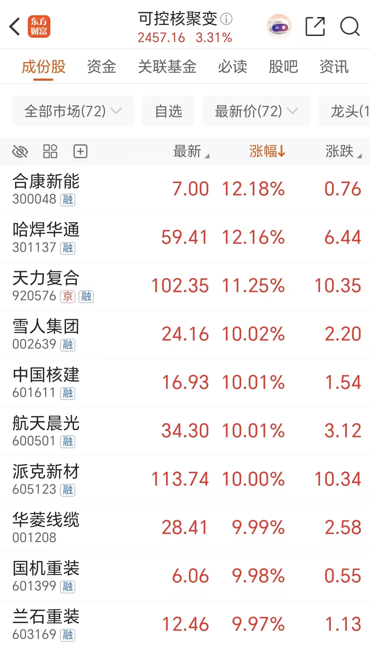 周四可控核聚变也延续强势,哈焊华通、天力复合、合康新能等涨超10%,雪人集团、中国核建、华菱线缆等多股涨停。