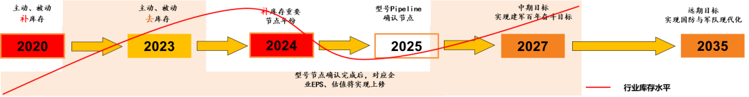 方正军工表示,军工行业有望开启新一轮补库周期:按库存周期的四个阶段来看,军工行业在2020年开启主动补库存,随后2021年批量采购到来,库存中原材料不断主动/被动进行补库,于2023年达到原材料库存的高值。行业于2024Q1进入主动去库存阶段(企业收入、利润下降显著),并于2025进入补库存周期。目前国防军工产业已进入新型号Pipeline管线持续落地期,批产可期。