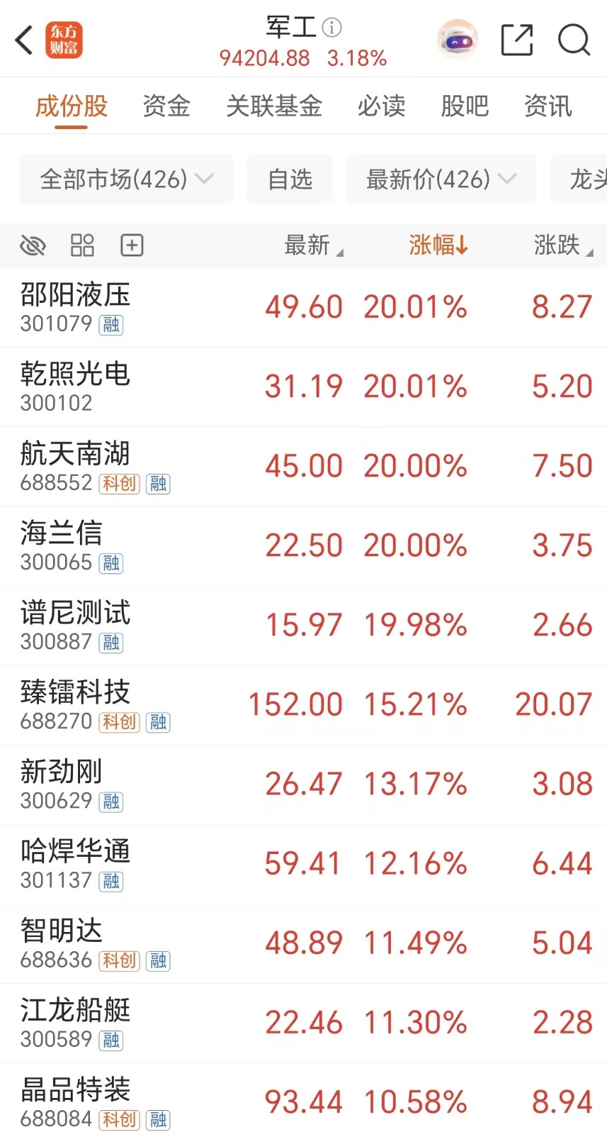 军工板块周四全面爆发,走出“逼空式”上涨行情。个股方面,邵阳液压、乾照光电、航天南湖、海兰信、谱尼测试等多股20CM涨停,内蒙一机、江龙船艇、臻镭科技、新劲刚等多股涨超10%;航天电器、天箭科技、中航机载、内蒙一机、银河电子等多股涨停。