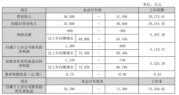 中国经济网北京1月28日讯 *ST声迅(003004.SZ)昨晚发布2025年度业绩预告。经财务部门初步测算,*ST声迅预计2025年年度实现归属于母公司所有者的净利润为-600万元至-1200万元,去年同期为-5119.57万元。公司预计2025年年度实现归属于母公司所有者的扣除非经常性损益后的净利润为-730万元至-1330万元,去年同期为-5525.29万元。公司预计2025年年度营收为36500万元至41500万元。