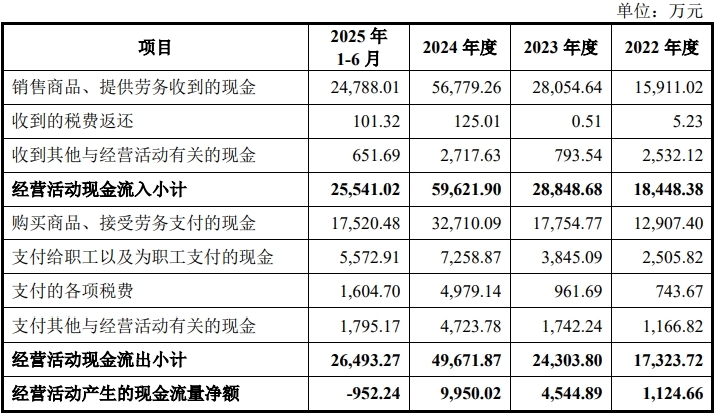 2022年、2023年、2024年和2025年1-6月,恒运昌经营活动产生的现金流量净额分别为1,124.66万元、4,544.89万元、9,950.02万元和-952.24万元,销售商品、提供劳务收到的现金分别为15,911.02万元、28,054.64万元、56,779.26万元和24,788.01万元。