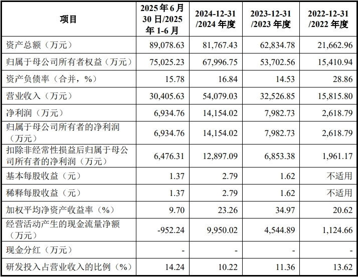2022年、2023年、2024年和2025年1-6月,恒运昌实现营业收入分别为15,815.80万元、32,526.85万元、54,079.03万元和30,405.63万元,实现净利润/归属于母公司所有者的净利润分别为2,618.79万元、7,982.73万元、14,154.02万元和6,934.76万元,实现扣除非经常性损益后归属于母公司所有者的净利润分别为1,961.17万元、6,853.38万元、12,897.09万元和6,476.31万元。