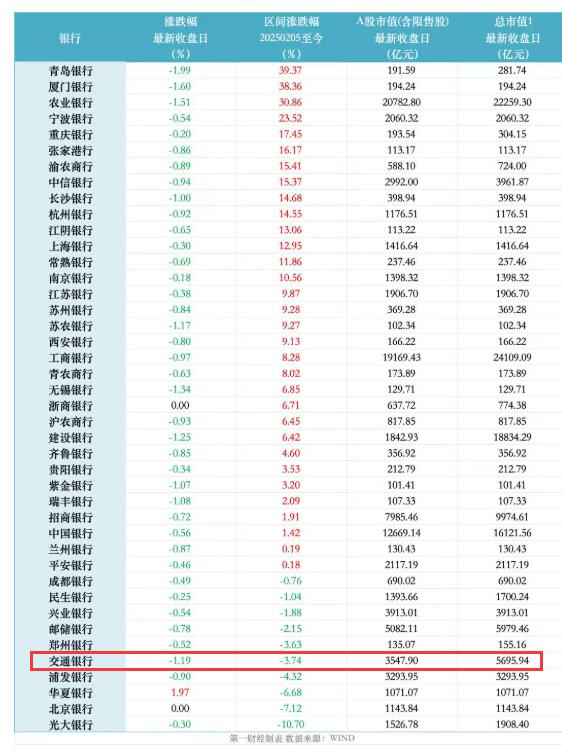 图表显示,交通银行蛇年股价跌幅3.74%,居国有行跌幅第一,居A股42只银行股跌幅第五。