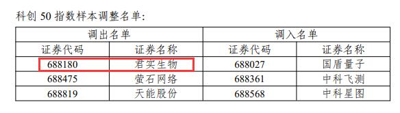 调整名单显示,君实生物(证券代码688180)被调出名单。