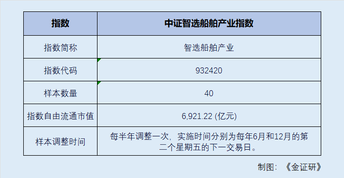 中证智选船舶产业指数选取40家业务涉及船用材料、船舶制造、船舶配套、航运等船舶产业相关领域的代表性上市公司证券作为指数样本,反映船舶产业领 域上市公司的整体表现。