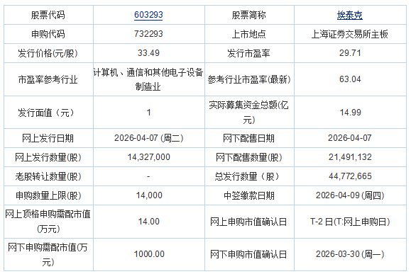 埃泰克2026年4月3日披露的首次公开发行股票并在主板上市发行公告显示,按本次发行价格33.49元/股和4,477.2665万股的新股发行数量计算,若本次发行成功,预计公司募集资金总额为149,943.66万元,扣除14,029.21万元(不含增值税)的发行费用后,预计募集资金净额为135,914.44万元。