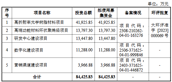 益丰新材原拟在深交所创业板发行新股不超过4,736万股,且占发行后总股本比例不低于25%,公司原拟募集资金84,425.83万元,用于高折射率光学树脂材料项目、高端功能材料环状聚烯烃项目、研发中心建设项目、数字化建设项目、营销渠道建设项目。