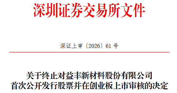 日前,益丰新材向深交所提交了《益丰新材料股份有限公司关于撤回首次公开发行股票并在创业板上市申请文件的申请》,保荐人向深交所提交了《中泰证券股份有限公司关于撤回益丰新材料股份有限公司首次公开发行股票并在创业板上市申请文件的申请》。根据《深圳证券交易所股票发行上市审核规则(2024年修订)》第六十二条的有关规定,深交所决定终止对益丰新材首次公开发行股票并在创业板上市的审核。
