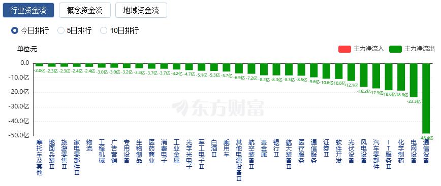 净流出方面,通信设备、电网设备、化学制药等净流出排名靠前,其中通信设备净流出48.40亿元。