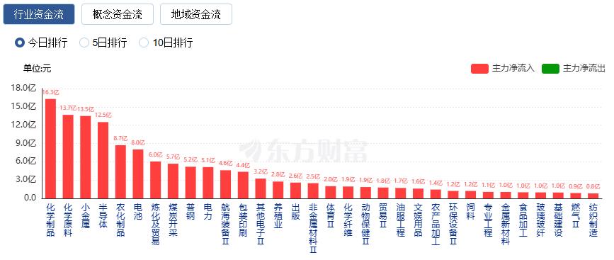 行业资金方面,截至收盘,化学制品、化学原料、小金属等净流入排名靠前,其中化学制品净流入16.30亿。