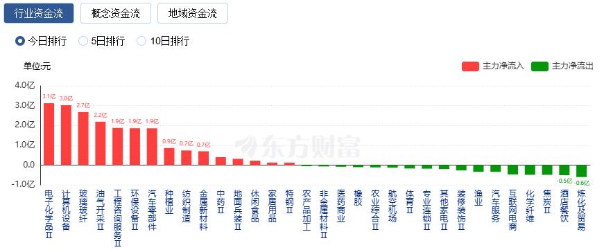 行业资金方面,截至收盘,电子化学品、计算机设备、玻璃玻纤等净流入排名靠前,其中电子化学品净流入3.12亿。