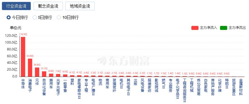 行业资金方面,截至收盘,半导体、消费电子、元件等净流入排名靠前,其中半导体净流入116.9亿。