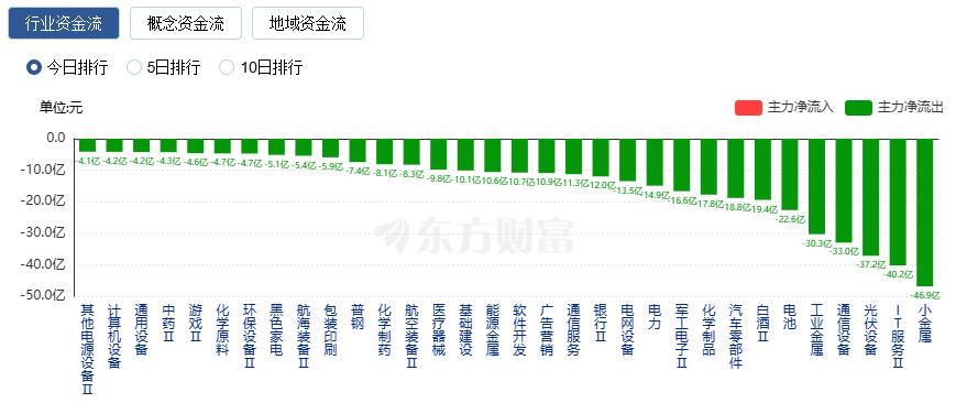 净流出方面,小金属、IT服务、光伏设备等净流出排名靠前,其中小金属净流出46.9亿元。