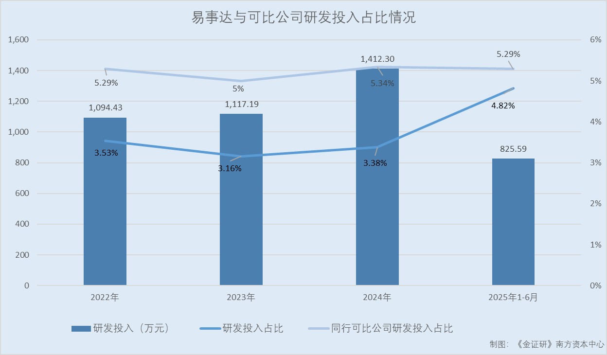 据签署于2025年12月25日的招股书,2022-2024年及2025年1-6月,易事达的研发投入金额分别为1,094.43万元、1,117.19万元、1,412.3万元、825.59万元,占同期营业收入的比例分别为3.53%、3.16%、3.38%、4.82%。