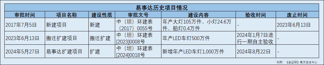 据编制日期2025年10月的LED车灯及车间智能化项目环评,“LED车灯及车间智能化项目”建设前,易事达的历史项目分别为“中山易事达光电科技有限公司搬迁扩建项目”(以下简称“搬迁扩建项目”)、“中山易事达光电科技有限公司扩建项目”(以下简称“扩建项目”)。