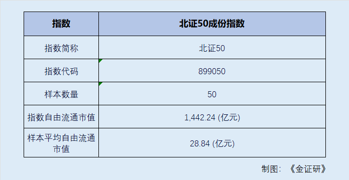 截至2026年4月24日,北证50中,43只总市值在100亿以下,5只在100-199亿之间,仅有2只是200亿以上。指数自由流通市值为1,442.24亿元,样本平均自由流通市值仅为28.84亿元。