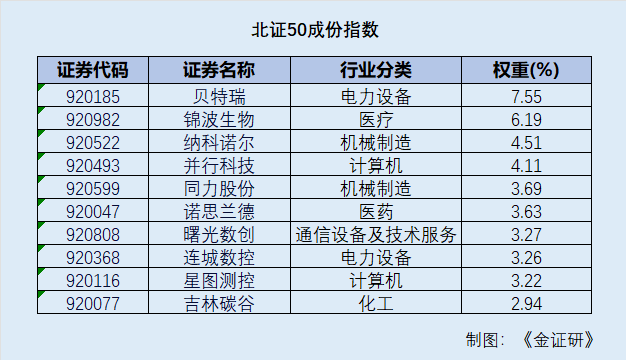 具体而言,北证50成份指数 (899050)前十大成分股分别为贝特瑞、锦波生物、纳科诺尔、并行科技、同力股份、诺思兰德、曙光数创、连城数控、星图测控以及吉林碳谷。截至2026年4月24日,前五大权重合计达26.05%;前十大成分股权重占比达42.36%,构建起中小企业创新矩阵。